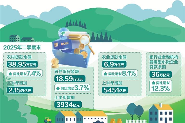 总的来看,今年二季度涉农金融投放增量扩面。2025年二季度金融机构贷款投向统计报告显示,2025年二季度末,农村贷款余额38.95万亿元,同比增长7.4%,上半年增加2.15万亿元。农户贷款余额18.59万亿元,同比增长3.7%,上半年增加3934亿元。农业贷款余额6.9万亿元,同比增长8.1%,上半年增加5451亿元。